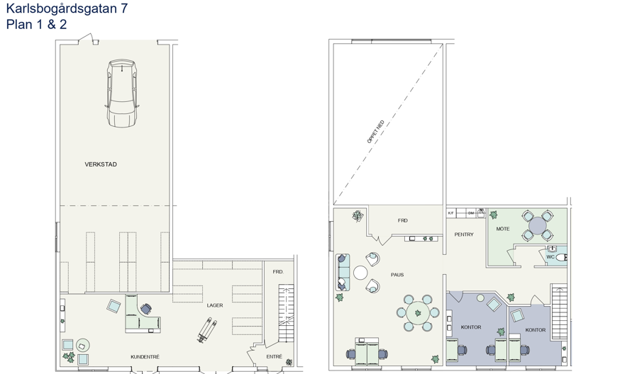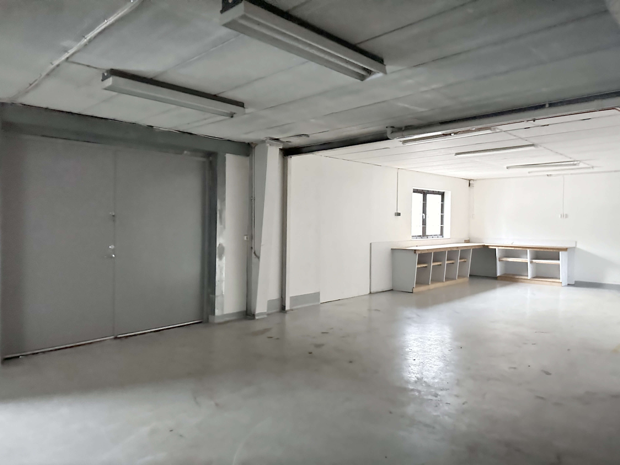 Verkstadsyta i markplan med ca 6 meter i takhöjd, markport med måtten 3,5 x 4 meter (bredd x höjd), samt bred dubbeldörr på andra sidan huset, 2 entrédörrar. På markplan finns också ett mindre förråd och en lågdel som kompliterar ytan.